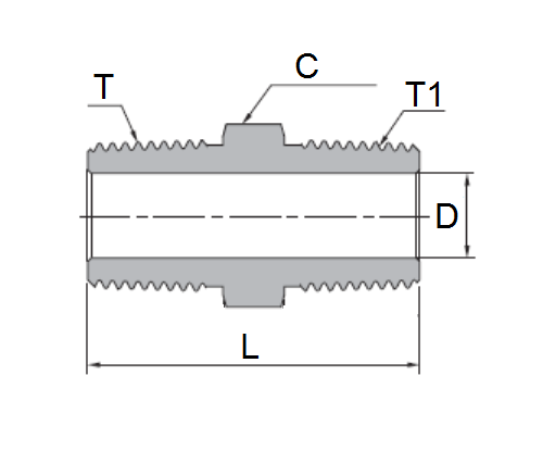 Hexová bradavka pro připojení dvou závitových trubek nebo armatur a prodloužení délky potrubí, šestiúhelníková střední sekce pro utažení klíčem.